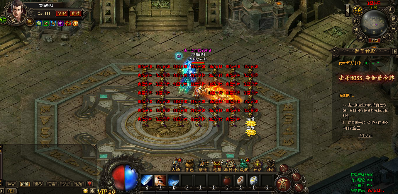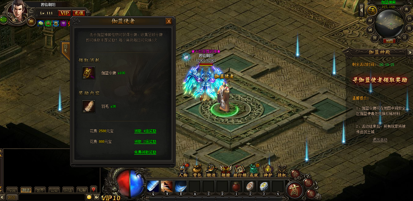 19:40~20:00,伽蓝使者将出现在神殿中央安全区,诸位英雄可前往使用伽蓝令牌兑换丰厚奖励。