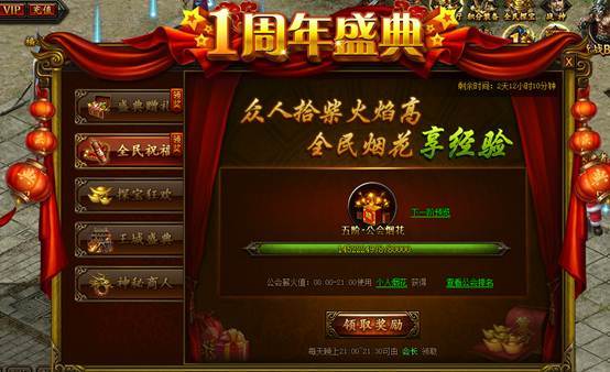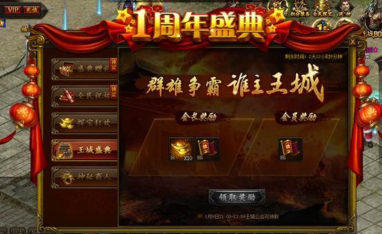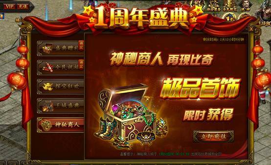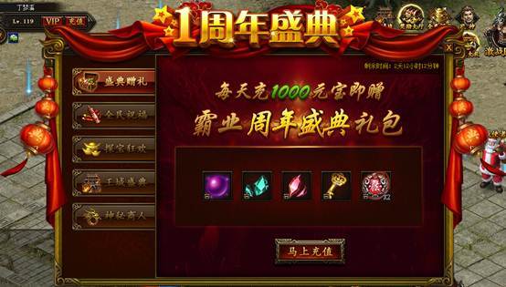 活动期间,每天充值达到1000元宝即赠霸业周年盛典礼包,海量材料天天免费得!