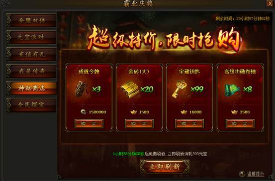 神秘商店限时开启,海量道具打折出售!活动期间,神秘商店每2小时免费刷新,海量商城道具超低价格出售,更有机会刷出内功经验卷、轮回丹、血符碎片、宝藏钥匙、极品时装等商城无出售道具,机会难得,不容错过!
