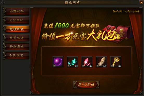 活动期间,只要充值达到1000元宝,即可领取价值1万元宝的霸业庆典大礼包!