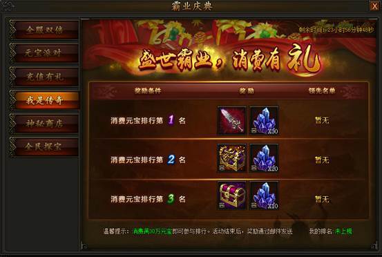 我是传奇奖励全面升级!珍稀道具拿到手软!活动期间,消费满30万元宝即可参与消费排行,活动结束时,排行前三玩家可获得极品装备奖励,打开宝箱装备任选!