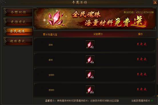 活动期间,使用魂珠碎片大、中、小材料获得魂珠碎片,获得的魂珠碎片达到一定数量即可领取大量材料返还,获得碎片越多,返还材料越多,升级魂珠事半功倍!