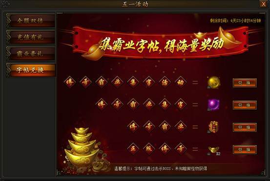 击杀Boss、未知暗殿怪物均有几率掉落字帖道具,集齐成套字帖即可领取对应奖励,可多次领取。