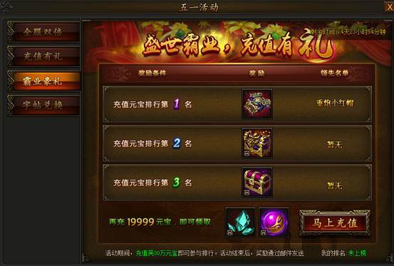 活动期间,充值元宝数满30w即可参与排行,排行前三即可获得对应霸业装备和极品首饰奖励