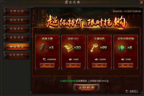 神秘商店限时开启,海量道具打折出售!活动期间,神秘商店每2小时免费刷新,海量商城道具超低价格出售,更有机会刷出内功经验卷、轮回丹、血符碎片、宝藏钥匙、极品时装等商城无出售道具,机会难得,不容错过!