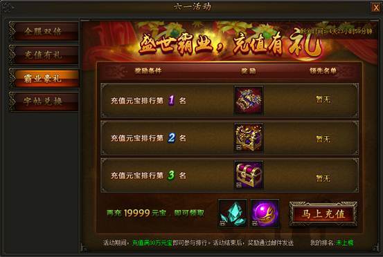 活动期间,充值元宝数满30w即可参与排行,排行前三即可获得对应霸业装备和极品首饰奖励