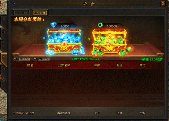 b. 奖池在每周日22:00点结算,仅公会会长、副会长、长老、精英可以获得分红奖励;