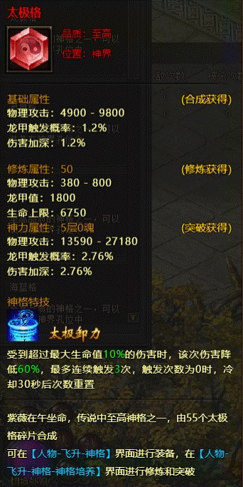 1. 太极格:受到超过最大生命值x%的伤害时,该次伤害降低60%,最多触发3次,触发次数为0时,冷却30秒后次数重置;