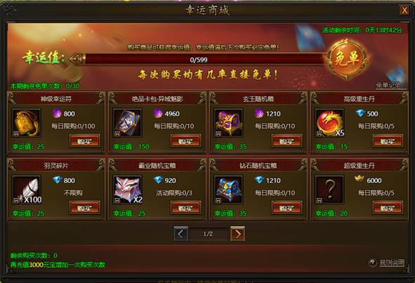 1. 活动期间,每充值一定元宝可以增加一次幸运商城礼包购买次数