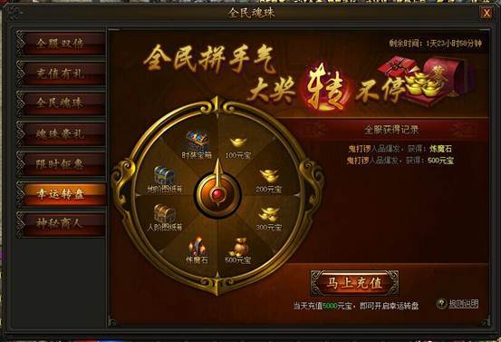 活动期间,充值并消费一定元宝即可使用幸运转盘,获得大量不绑定元宝返还,更有机会得到时装宝箱,获得珍稀时装奖励。