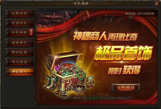 活动当天,神秘商人出现在比奇城,花费少量元宝即可重铸首饰,重铸有机会大幅提升首饰等级,集齐高阶神装不是梦!