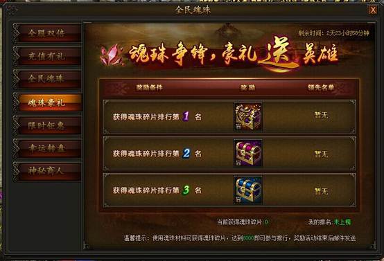 活动期间,使用魂珠碎片大、中、小材料获得魂珠碎片,获得碎片数目达到6000即可参与碎片获得排行,有机会获得霸业装备、极品首饰奖励!活动结束后,奖励通过邮件发送。