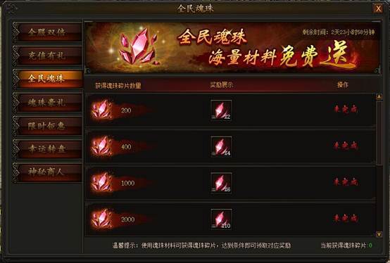 活动期间,使用魂珠碎片大、中、小材料获得魂珠碎片,获得的魂珠碎片达到一定数量即可领取大量材料返还,获得碎片越多,返还材料越多,升级魂珠事半功倍!