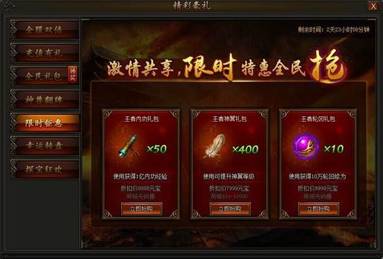 活动期间,内功、羽毛和轮回等材料礼包限时折扣,超低价格,不容错过!