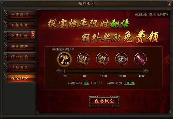 探宝超值回馈限时开启!活动期间探宝可获得祝福值,祝福值达到一定数值即可领取霸业装备奖励!