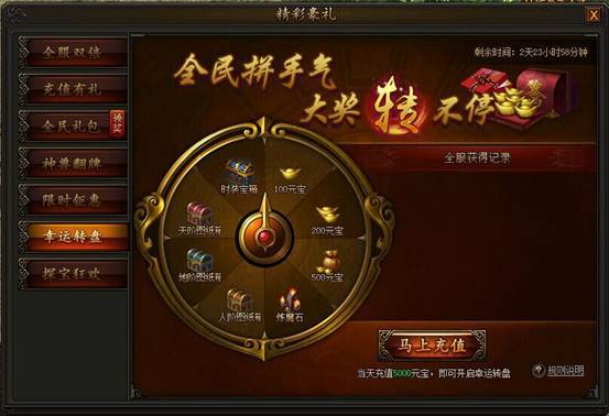 活动期间,充值并消费一定元宝即可使用幸运转盘,获得大量不绑定元宝返还,更有机会得到时装宝箱,获得珍稀时装奖励。