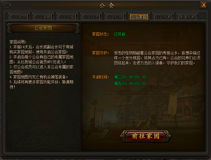 1、公会家园开启后,每周二、周五20:00-20:30将有怪物入侵各大公会的家园;