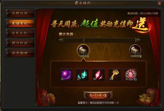 活动期间,充值元宝即可领取两档丰厚奖励,每天均可领取一次,不容错过!