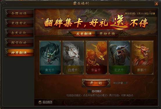 活动期间,每充值2000元宝,可获得一次翻牌机会,抽取一张卡片;集齐各类卡牌,可组合兑换不同档次的奖励。