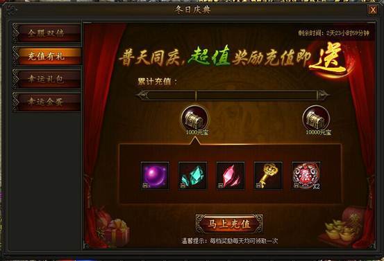 活动期间,充值元宝即可领取两档丰厚奖励,每天均可领取一次,不容错过!