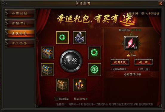 活动期间,每购买一次礼包可获得一次抽奖机会,还可花费元宝进行刷新!抽奖次数和礼包购买次数每日零点清零,请及时抽奖。