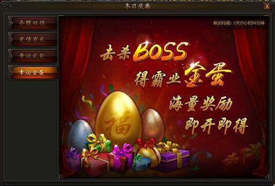 活动期间,击杀BOSS可获得霸业金蛋,打开即可获得转生丹、经验丹和绑定元宝奖励。