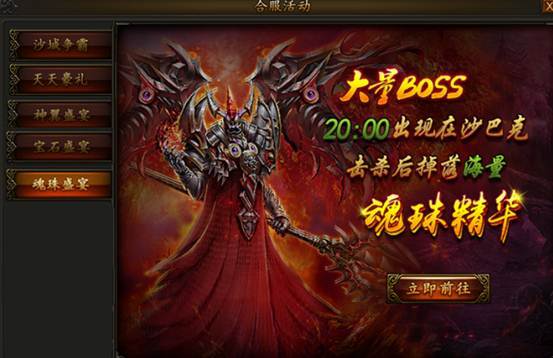 活动期间,每日下午18:00遗忘古城刷新超级元宝BOSS,击杀后掉落海量不绑定元宝,所有玩家均可拾取,手快有手慢无,抓紧机会不要错过!遗忘古城可从比奇城NPC处传送进入。