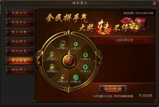 活动期间,充值并消费一定元宝即可使用幸运转盘,获得大量霸业玉道具,使用霸业玉后即可前往霸业商城内购买珍稀道具,精彩不容错过。