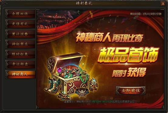 活动第四天,神秘商人出现在比奇城,花费少量元宝即可重铸首饰,重铸有机会大幅提升首饰等级,集齐高阶神装不是梦!