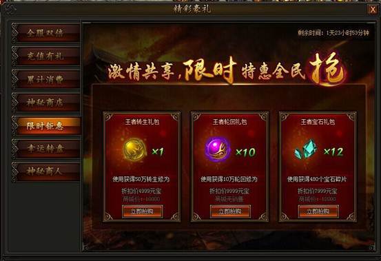 活动第一天和第二天,转生+轮回+宝石材料礼包限时折扣,活动第三天和第四天,内功+羽毛+魂珠礼包限时折扣,超低价格,不容错过!