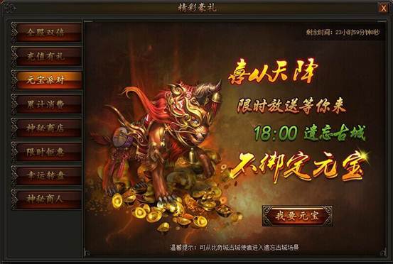 活动期间下午18:00,可通过比奇城古城使者NPC处进入遗忘古城,击杀boss后掉落不绑定元宝,掉落物品无归属。