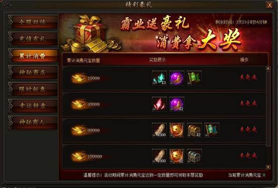 活动期间,累计消费一定数量元宝,即可领取对应档奖励,每个角色只能领取一次。