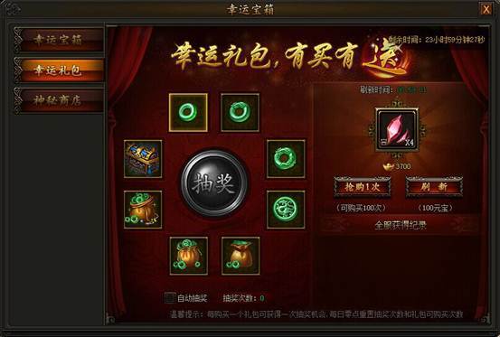 活动期间,每购买一次礼包可获得一次抽奖机会,还可花费元宝进行刷新!抽奖次数和礼包购买次数每日零点清零,请及时抽奖。