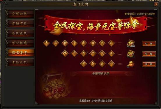 活动期间,探宝可能获得“传奇霸业盛典豪礼”字帖,集齐字帖可兑换海量不绑定元宝奖励!