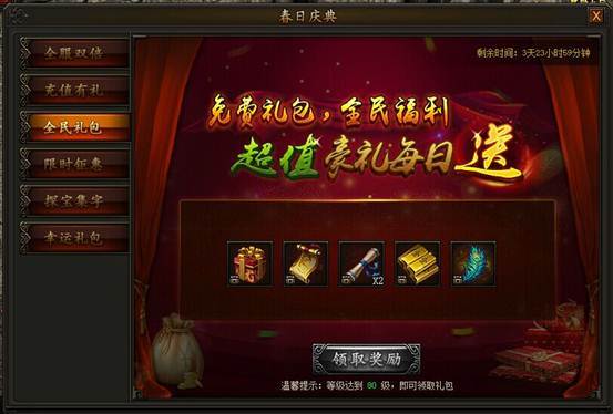 活动期间,80级以上(包含80级)玩家登录即可领取免费奖励,每天均可领取一次。