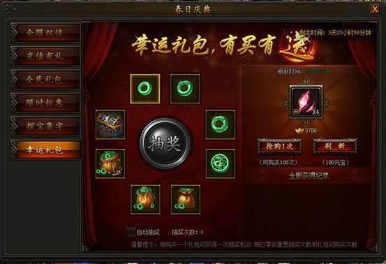 活动期间,每购买一次礼包可获得一次抽奖机会,还可花费元宝进行刷新!抽奖次数和礼包购买次数每日零点清零,请及时抽奖。