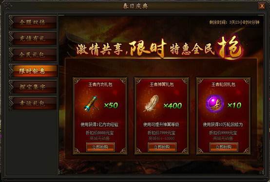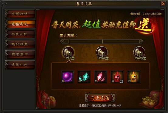 活动期间,充值元宝即可领取三档丰厚奖励,每天均可领取一次,不容错过!