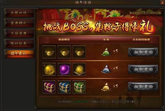 活动期间每天10:00-22:00土城随机刷新大批福兽,击杀后掉落多种粽子,粽子可在活动界面随机兑换多种奖励!