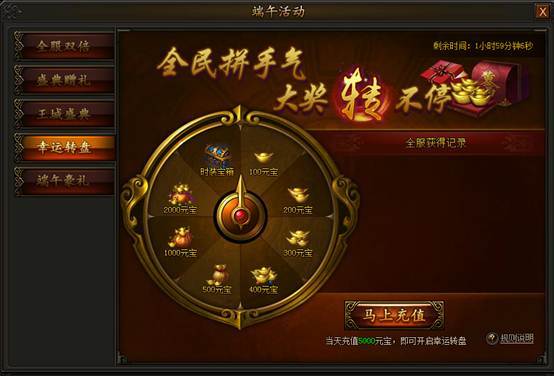 全民拼手气,大奖转不停!活动期间单个角色充值达到5000元宝可以开启此功能,每消费达到2000元宝可以获得1张传奇奖券,每充值2000元宝可以获得一张霸业奖券,使用一张传奇奖券和一张霸业奖券可以进行抽奖,百分百中奖率还不赶快参与!