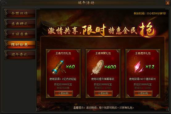 活动期间,内功、神翼、魂珠礼包限时折扣,超低价格,不容错过!