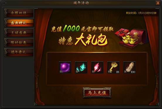 活动期间,每天充值达到1000元宝均可领取超值大礼包,海量材料天天免费得!