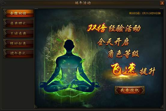 活动时间,全服双倍经验连开四天,海量经验轻松获得,双倍经验可与多倍经验卷轴、VIP多倍经验叠加,挂机经验大幅提升!