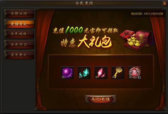 活动期间,每天充值达到1000元宝均可领取超值大礼包,海量材料天天免费得!