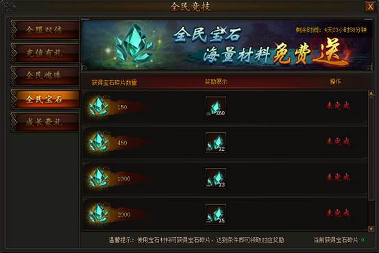 活动期间,使用宝石结晶大、中、小材料获得宝石碎片,获得的宝石碎片达到一定数量即可领取大量材料返还,获得碎片越多,返还材料越多,升级宝石事半功倍!