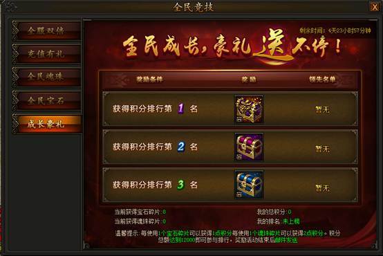 活动期间每获得1个宝石碎片可获得1点积分,每获得1个魂珠碎片可获得2点积分,获得积分达到12000即可参与排行,有机会获得霸业装备、极品首饰奖励!活动结束后,奖励通过邮件发送。